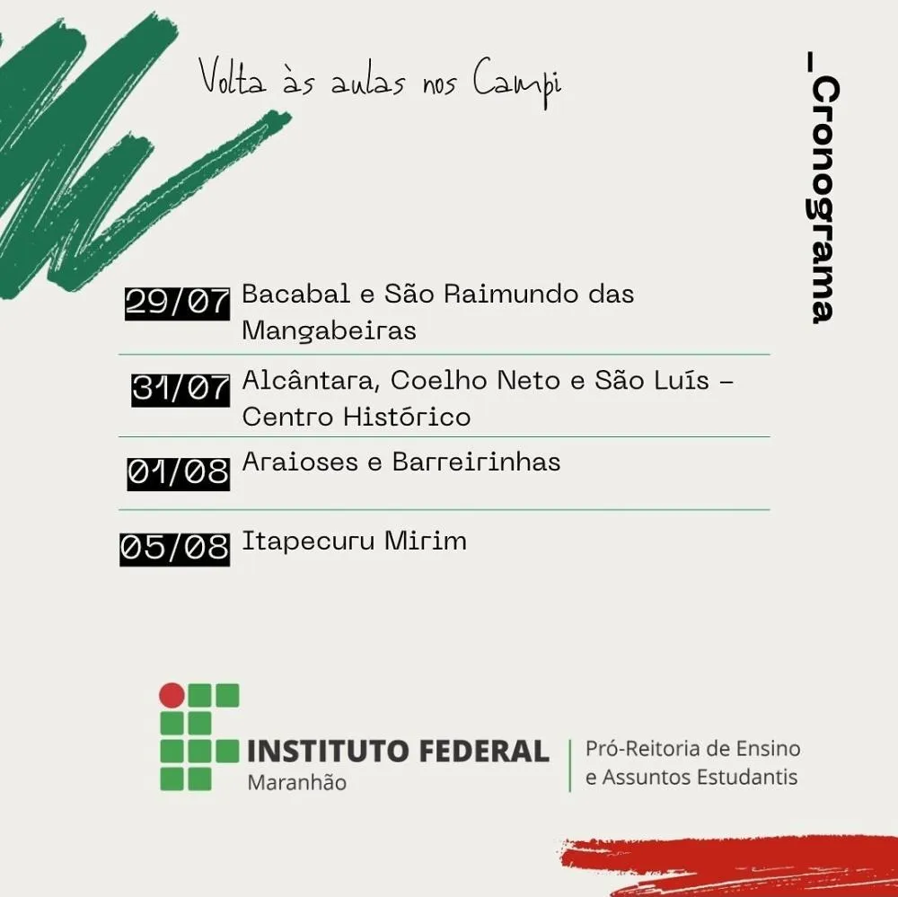 O Campus Carolina já retornou em 13/05 e os campi Barra do Corda, Imperatriz, Porto Franco e Viana não aderiram à greve e seguem com seus respectivos calendários acadêmicos normais.