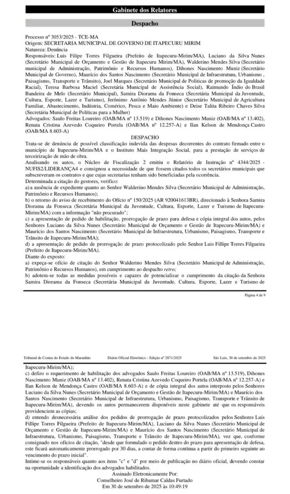De acordo com o documento publicado na última terça-feira (30/09), trata-se denúncia de possível classificação indevida das despesas decorrentes do contrato firmado entre o município de Itapecuru Mirim e o Instituto Mais Integração Social (IMIS) para prestação de serviços de terceirização de mão de obra.