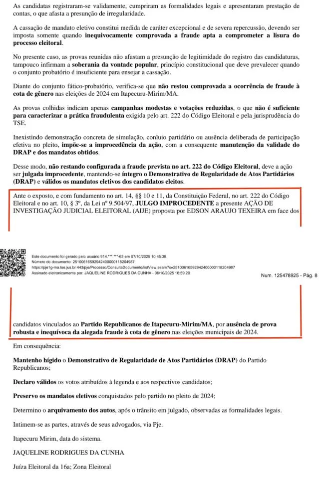 Na manhã desta terça-feira (7), a juíza eleitoral Dra Jaqueline Cunha, titular da 16ª zona, de Itapecuru Mirim, proferiu sentença sobre processo que pede a cassação de vereadores no município.