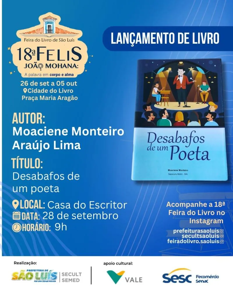 No sábado (7), véspera do encerramento, às 19h, na praça Gomes de Souza, o poeta Itapecuruense lançará o livro Desabafos de um Poeta, obra de sua autoria que também foi lançado na 18ª Feito do Livro de São Luís em 28 de setembro passado.