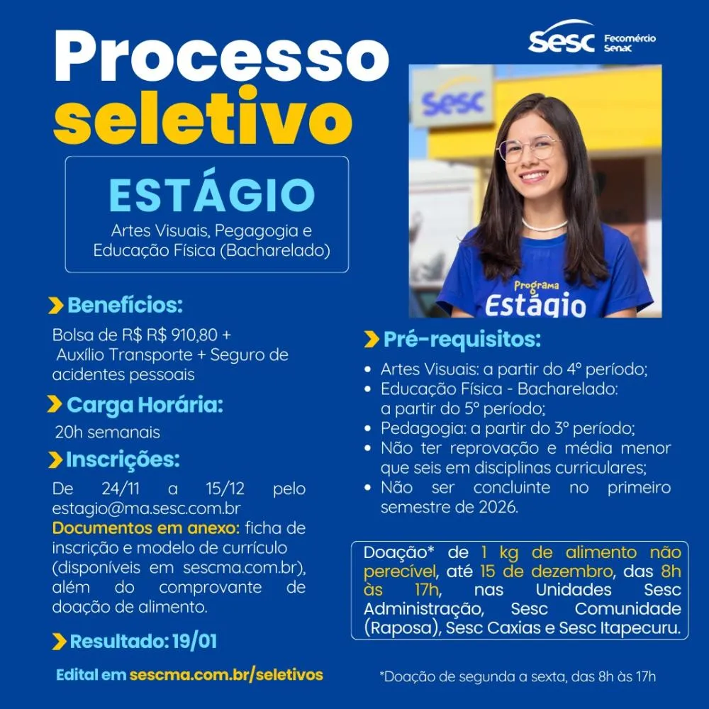 O Sesc está com inscrições abertas para o estágio 2026 com vagas em quatro municípios do Maranhão.