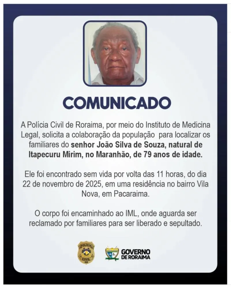 A Polícia Civil do estado de Roraima divulgou comunicado informando o falecimento de um idoso com idade de 79 anos que aguarda reconhecimento.