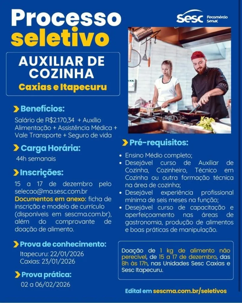 O Sesc Maranhão está com seletivo aberto para preencher vagas nas Unidades Operacionais de Caxias e Itapecuru. As oportunidades são destinadas aos cargos de Auxiliar de Cozinha e Nutricionista.